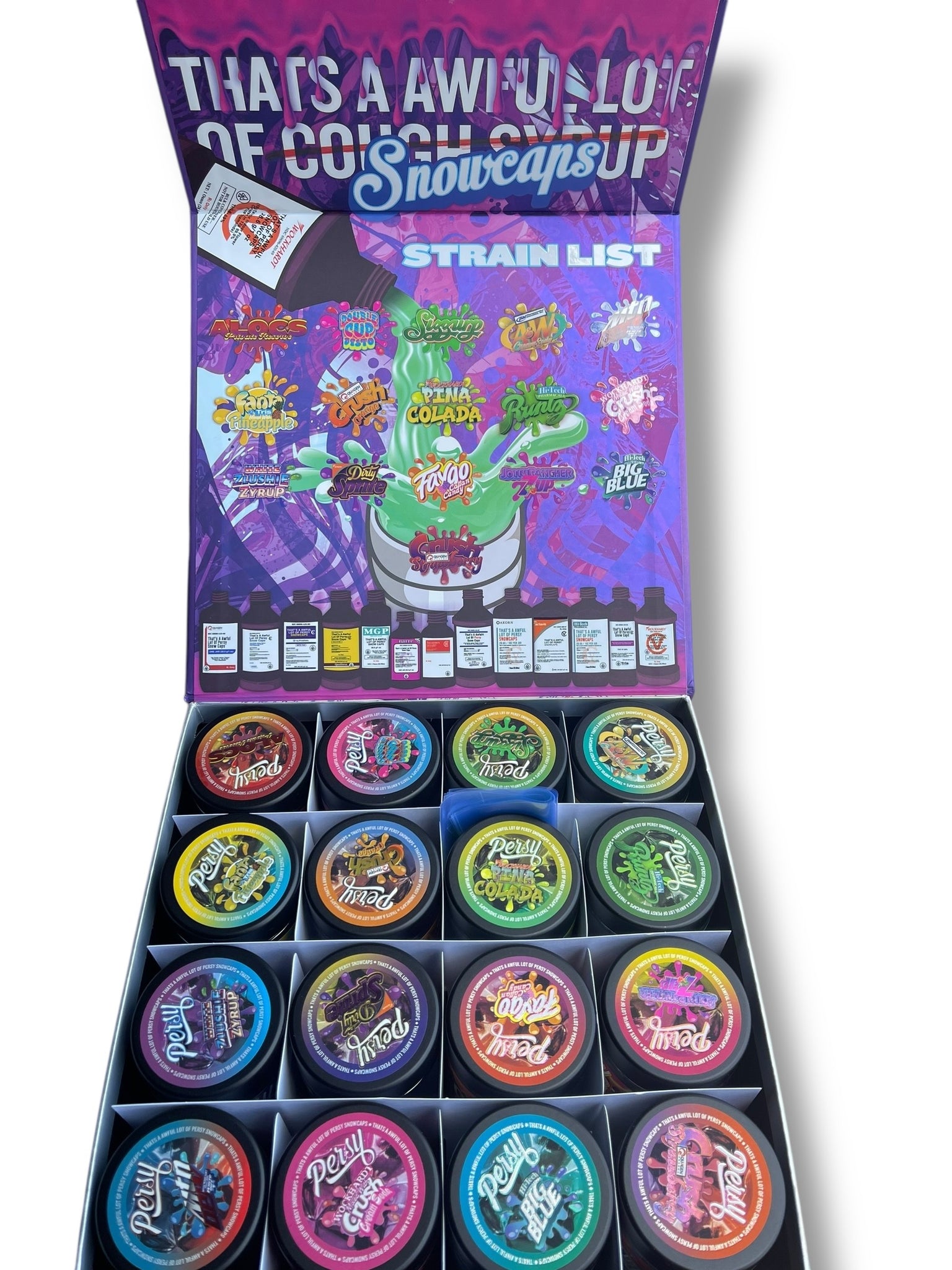 Persy Snowcaps Cough Syrup 16-1oz Empty Glass Jars - Varity Pack 16 Flavors in box 1 pound